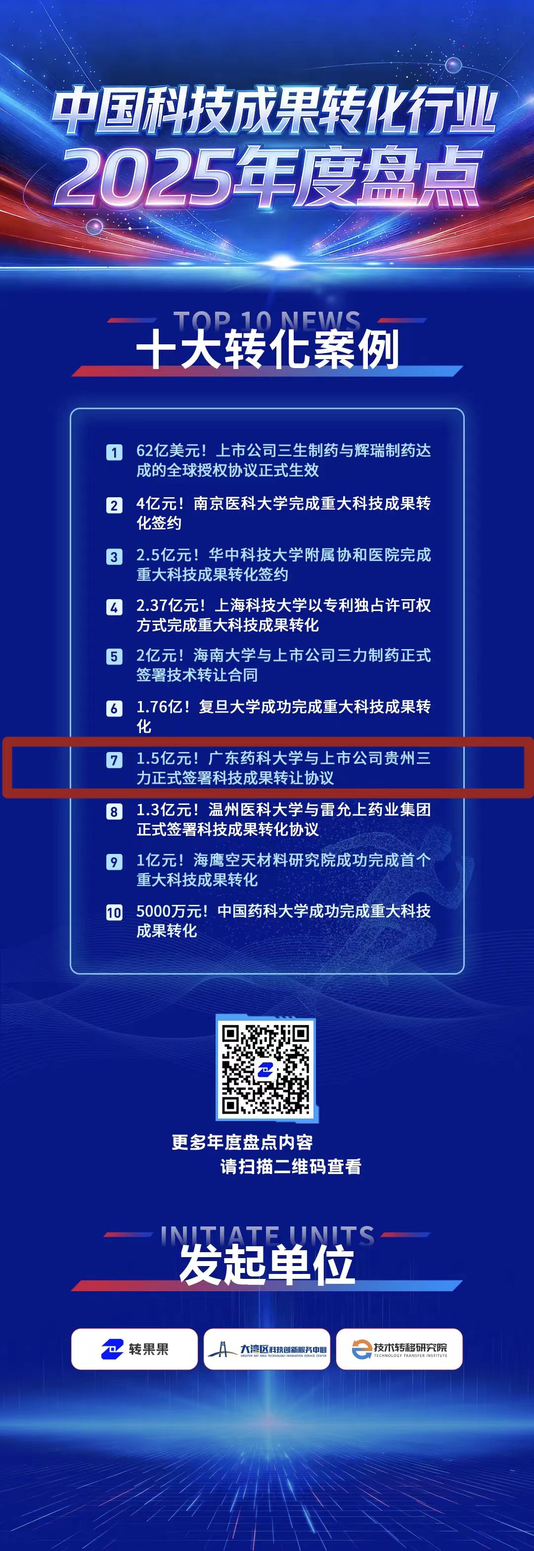 近期,转果果平台、大湾区科技创新服务中心和行业平台技术转移研究院启动“中国科技成果转化行业2025年度盘点”。我校案例《1.5亿元!广东药科大学与上市公司贵州三力正式签署科技成果转让协议》入选中国科技成果转化行业2025年度十大转化案例。