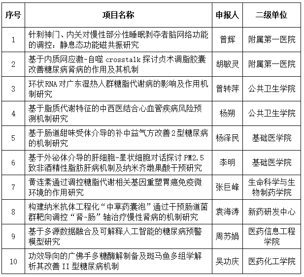 根据《关于开展2026年度广东省中医药局中医药科研平台专项申报工作的通知》(粤中医办函〔2025〕37号),科学技术部全校范围内征集,项目负责人自愿申报,科学技术部对申报材料进行审核并组织专家进行遴选,现根据评审结果,拟推荐以下10个项目,见附表。现予以公示。
