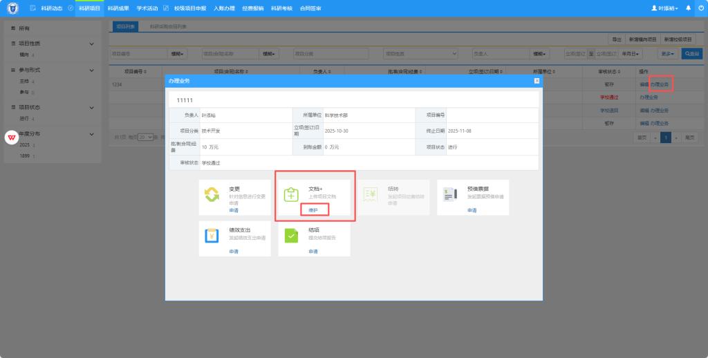 科研系统文档上传(不限量):点击办理业务-“文档+”--维护-上传文件。